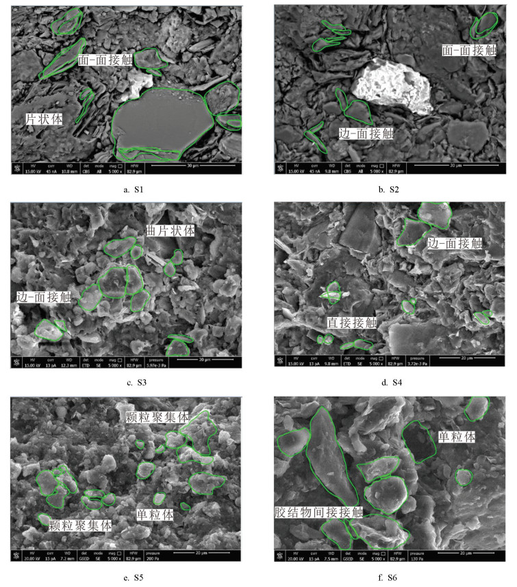在排列特征上,S1和S2组岩石中以片状单元体居多且大量面-面叠聚体形状不一,故这种岩石单元体颗粒间通常以斜向、条状、无向等分散形式排列。S3和S4组岩石黏粒含量少,颗粒间一般会以非定向的紊乱状排列结构形式存在。S5和S6组岩石单元体以粒状堆叠结构为主,其中还含有粒状架空结构,其单元体间的堆叠可形成较密实的结构。