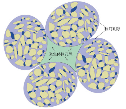 • 岩石微观结构中的单元体排列和连结特征与宏观力学性质密切相关。红层泥岩中,以粒状颗粒单元为主的单元体结构越密实,其膨胀潜势越大。以片状颗粒聚集体单元为主的蒙脱石等黏土矿物含量较高,其膨胀潜势也相对较大。矿物的叠聚体或黏土矿物包裹着非黏土矿物而成的复合体均存在以粒状颗粒单元为主的单元体结构,形状不规则且多为粒状堆叠结构,结构较密实,多见于以高岭石矿物为主的岩石中,膨胀潜势较大[35]。除一般的粒状堆叠体外还存在粒状架空结构,图 8为岩石颗粒单元体和粒状聚集体结构示意图,其中聚集体间架空孔隙较大。