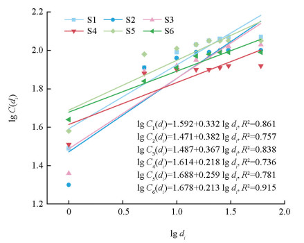 对岩样的C(di)与di进行双对数曲线线性拟合,如图 9所示,其斜率值即为分形维数。图 9表明各组岩样的C(di)与di拟合相关性系数较高,拟合程度较好。其中,岩样S6的拟合程度最高,相关性系数R2=0.915。就整体拟合情况而言,内江沙溪庙组岩样的C(di)与di拟合程度大于南充遂宁组与南充沙溪庙组,得到S1-S6各组岩样基于数量分形的分形维数值分别为0.332、0.382、0.367、0.218、0.259、0.213。南充遂宁组的孔隙数量分形较高,说明岩样的孔隙特征较复杂,孔隙结构不均匀。由前文分析可知,该岩样单元体结构以片状叠聚体为主,单元体间多以面-面接触和点-面接触连结,因此易形成各种大小不一、形状不规则、孔隙壁面粗糙的孔隙结构特征。以内江沙溪庙组膨胀性最高的S5和S6组泥岩为例,对应本节中这2组泥岩的孔隙分形维数相对最小,分形维数值越低其孔隙分布则越均匀,孔隙结构也更加规则,增大了水分沿孔隙通道进入岩石内部的概率,从而增大了水-岩(黏土矿物)接触面积及膨胀趋势。以上分析从侧面印证了微观孔隙分形维数与整体膨胀趋势的相关性。