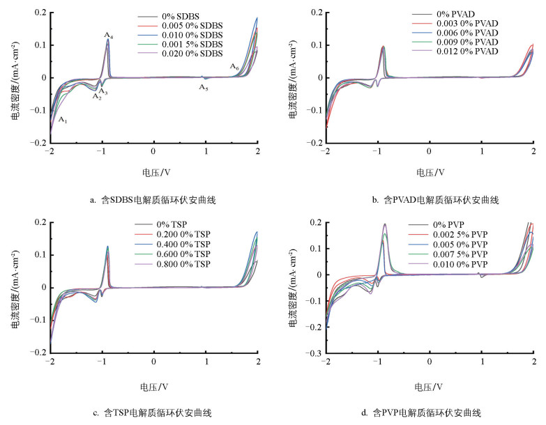 图 2a可知,SDBS可以增加铅电极的氧化还原电流,当SDBS质量分数为0.010 0%时,氧化还原电流达到峰值,同时铅的氧化与还原电位均发生正移,说明SDBS可以促进铅电极在电解质中的氧化还原过程。由图 2b可知,PVAD对铅的氧化电流影响较小,当PVAD质量分数增加到0.006 0%时,铅电极的析氧过电位逐渐增大,说明适量的PVAD可以降低水的消耗,从而延长胶体电池的使用寿命。由图 2c可知,TSP可以增加氧化还原电流,其质量分数为0.200 0%~0.600 0%时,铅电极的析氢过电位随着质量分数的增大而增大。由图 2d可知,PVP能够增加析氢析氧过电位,随着其质量分数的增加,铅氧化还原电流也随之增加。