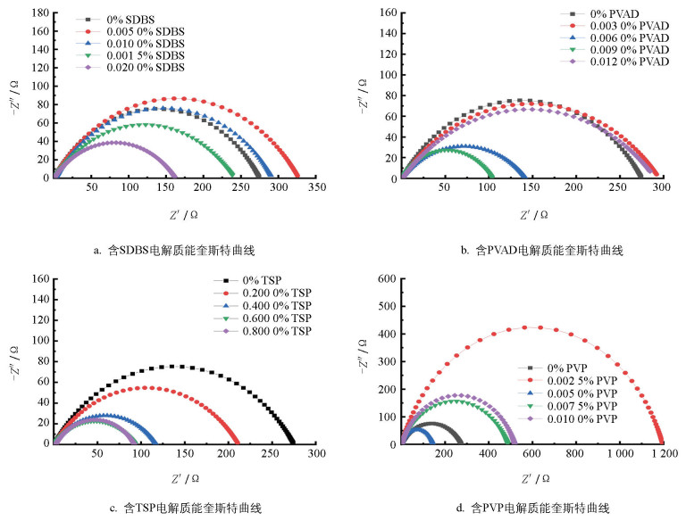 • 铅电极在含有不同添加剂胶体电解质中的交流阻抗图谱如图 3所示。由图 3a可知,随着SDBS质量分数的增加,半圆弧半径逐渐减小,说明SDBS的加入可以降低电化学反应中的电荷转移内阻,这有益于胶体电池性能的提升。由图 3b可知,半圆弧半径随着PVAD质量分数的增加先增加后减小,当PVAD质量分数为0.009 0%时,半圆弧半径最小,此时电荷转移内阻最小。这表明PVAD质量分数的增加会使胶体电解质更加粘稠,导致三维空间结构过于紧密,从而阻碍了反应过程中的电荷传输,对电池性能不利。由图 3c可知,磷酸钠的加入可以显著降低电荷转移内阻,当其质量分数大于0.600 0%时,电荷转移内阻变化不大。由图 3d可以看出,0.005 0%的PVP可以降低电荷转移内阻。由以上结果可以看出,在一定质量分数范围内,4种添加剂都能降低电荷转移电阻,提升电池活性物质利用率,从而提升电池性能。