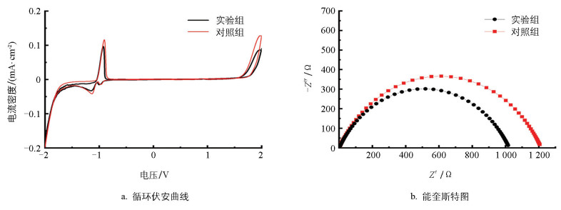 • 铅电极在含有复合添加剂胶体电解质中的循环伏安曲线和交流阻抗图谱如图 4所示。由图 4a可知,与不含添加剂的胶体电解质对比,铅电极在含有复合添加剂的胶体电解质中具有更高的析氢析氧过电位,说明该胶体电解质能够抑制铅电极的自放电并降低电池的水消耗。由图 4b可知,铅电极在含有复合添加剂的胶体电解质中具有更低的电荷转移电阻,这说明该胶体电解质有利于提升活性物质的利用率,提升胶体电池性能。