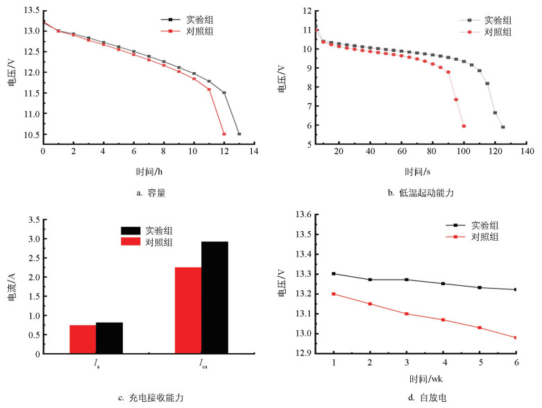 图 5可知,添加复合添加剂后,电池的性能得到了综合提升。容量由7.49 Ah提升到8.06 Ah; 低温起动能力提升约20%; 充电接收能力从3.04提升到3.60,6 wk后电池开路电压仅衰减0.6%。这说明该复合添加剂能够增加胶体电池的活性物质利用率,缓解因环境温度降低而导致的电池容量下降现象,改善极板硫化,抑制不可逆硫酸铅的形成以及抑制电池自放电,提升电池寿命的优点。