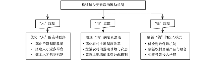 宜居宜业和美乡村建设延续并深化了“城乡融合发展是人类社会演进必然趋势”的理论认知[13]。马克思主义城乡关系理论深刻揭示,城乡对立是私有制条件下生产力发展到一定阶段的产物,随着生产力高度发展与社会形态的演进,城乡融合必将成为历史演进的内在要求。这一理论认识为理解当代城乡关系变革提供了根本遵循。长期以来,城乡二元结构的固化是导致农村发展滞后的根本原因[14],其深层困境在于要素配置的制度性壁垒与发展权利的非均衡性,具体表现为农村资源单向流出、城市虹吸效应过强、公共资源配置失衡等结构性问题。和美乡村建设的深层意蕴正在于通过体制机制创新,打破这一结构性壁垒,促进土地、资本、人才、技术等要素在城乡之间实现双向平等流动。要素双向流动机制的构建,需要从“人” “地” “钱”3个关键维度协同突破(图 2)。在“人”的维度,一是深化户籍制度改革,畅通农民市民化通道,确保进城落户人口享有均等公共服务;二是搭建人才返乡平台,通过政策激励吸引乡贤能人、专业人才投身乡村建设;三是健全人才共享机制,推动智力回流与技术下乡常态化。在“地”的维度,一是深化农村土地制度改革,稳妥推进农村集体经营性建设用地入市;二是盘活农村闲置宅基地与农房资源,发展乡村新业态,唤醒“沉睡”资产;三是完善土地增值收益分配机制,保障农民公平分享土地价值红利。在“钱”的维度,一是健全财政保障机制,确保投入与乡村振兴任务相匹配;二是创新农村金融产品与服务,引导工商资本有序参与乡村建设;三是构建财政资金与社会资本协同发力的多元投入格局,形成可持续的资本支撑体系。从实践层面来看,城乡融合发展的关键落脚点在于县域。县域作为城市与乡村的枢纽节点,兼具城市性与乡村性的双重特征,是破除城乡二元结构、实现要素优化配置的基本单元。以县域为切入点统筹推进农业农村现代化,既是实现农民就地就近就业、拓宽增收渠道的重要路径,也是缓解大规模人口流动压力、促进县域经济高质量发展的重要举措。为此,必须健全城乡融合发展体制机制,完善一二三产业融合体系,推进农业与加工、物流、文旅、康养等业态深度融合,形成“农业+”跨界融合的现代产业生态。在融合过程中,需完善“联农带农”机制,通过订单收购、股份合作、保底分红等模式,确保小农户能够分享产业链增值收益,推动新型农业经营主体与小农户有机衔接[15]。这既是缩小城乡发展差距、扎实推进共同富裕的必由之路,也是构建和谐城乡关系、实现乡村和美愿景的重要支撑。通过城乡融合发展,使乡村在现代化进程中不再是被动边缘化的角色,而是与城市功能互补、利益共享的有机组成部分,最终形成工农互促、城乡互补、协调发展、共同繁荣的新型工农城乡关系。