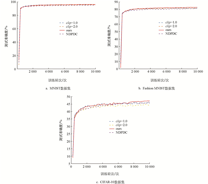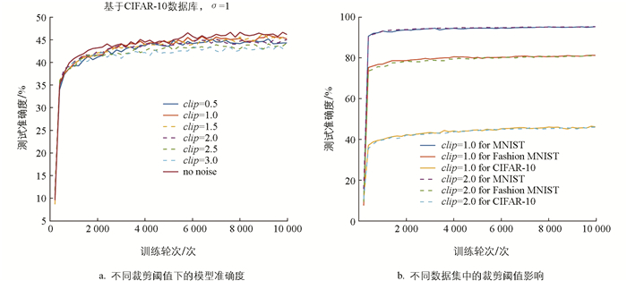 当裁剪阈值过大,所注入的差分噪声幅度增加,会影响模型准确度;若裁剪阈值过小,则梯度偏离原始值过大,同样会导致模型准确度下降。根据图 2b在不同数据集上得到的实验结果可以看出,不同裁剪阈值可能得到接近的模型准确度,进一步表明裁剪阈值与模型准确度之间存在显著关系。