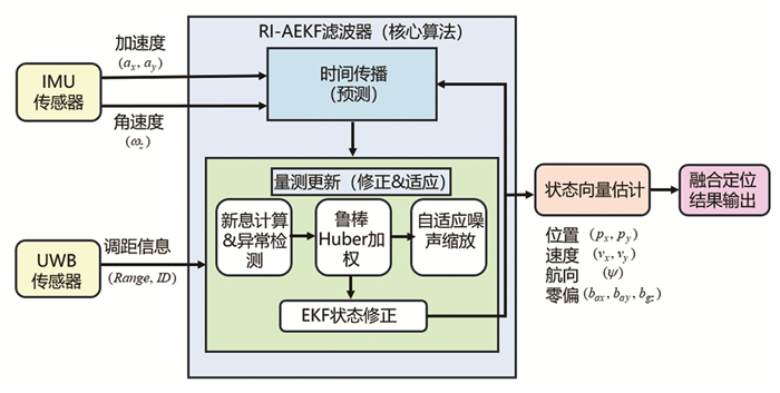 为提高UWB/IMU紧组合滤波在复杂室内环境下的鲁棒性,本文在传统EKF的量测更新阶段引入鲁棒新息统计与自适应观测噪声调整,核心思想是利用新息及其协方差构造标准化新息统计量,识别异常量测,通过鲁棒权函数给每个量测赋予不同的权重,然后将权重映射到观测噪声协方差Rk,实现对NLOS和野值的抑制,最后对整体噪声水平引入缓慢自适应因子,使Rk能自动匹配实际噪声强度。基于RI-AEKF的UWB/IMU紧组合定位系统如图 1所示。