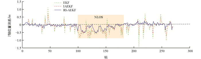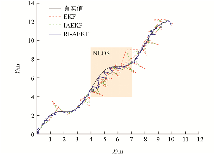 在传统EKF中,Rk预先设为常数对角矩阵,当UWB量测受到NLOS和野值影响时,滤波性能将明显恶化。
