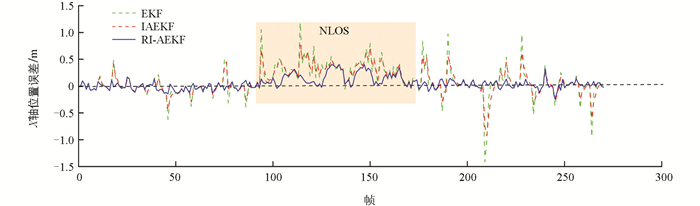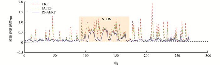 由图 3可知,EKF、IAEKF与RI-AEKF 3种算法在轨迹跟踪上的表现存在显著差异。EKF算法在整个试验过程中能够较好地跟随真实轨迹,但在NLOS区域出现较大偏差,导致定位精度下降。相比之下,IAEKF算法在NLOS区域表现出更为稳定的轨迹跟踪,减少了误差,这表明其在动态环境中的适应能力较强。而RI-AEKF算法在所有测试阶段均表现优异,尤其是在NLOS环境中,能够有效抑制噪声影响,保持较高的定位精度,体现了鲁棒新息统计方法在抗干扰能力方面的优势。总体而言,RI-AEKF算法在复杂环境中的定位精度和稳定性均优于其他2种算法。