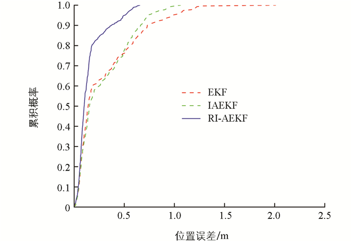 图 7给出了3种算法二维位置误差的累积分布函数(CDF),纵坐标表示误差不超过横坐标给定值的累积概率,进一步反映了误差分布特性。RI-AEKF曲线在小误差段上升最快,在同一误差阈值下对应的累积概率始终高于另外2种算法,说明大部分历元的二维误差集中在较小范围内;IAEKF曲线整体优于EKF,但在中、大误差段仍存在一定“长尾”。结合RMSE与最大误差结果,可以认为鲁棒新息统计在抑制大偏差样本、压缩误差尾部方面效果更为突出,使位置误差分布更集中,有利于提升系统的整体可靠性。