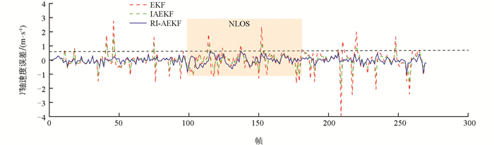 在Y轴方向上,RI-AEKF的误差表现同样优于其他2种算法。由图 5可知,RI-AEKF呈现出更加平稳的走势,误差波动相对较小,符合其在RMSE数据中显示出的较低值(0.162 m)。IAEKF和EKF的误差波动较大,尤其是在某些较高峰值时,误差明显增大。尽管如此,IAEKF的误差较EKF有所改善,尤其在初始阶段波动较小,但依然无法与RI-AEKF相比。