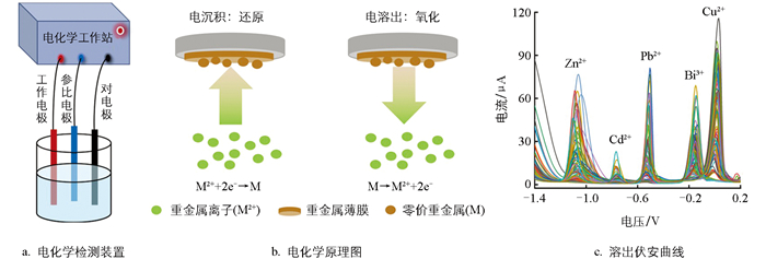 测试参数设置如下:首先,在搅拌条件(600 r/min)下,应用设定的沉积电位执行电沉积180 s,使Bi3+与目标金属离子共同沉积于电极表面并形成金属薄膜;随后,停止搅拌并静置10 s,使溶液能够达到平衡;接着,执行电溶出,在-1.4 ~ 0.2 V电位范围内进行方波阳极扫描,并记录溶出伏安曲线(如图 1c所示)。每次测量完成后,为去除电极表面残留的重金属,在0.35 V的电位下清洗120 s,以保证后续测试的重复性[32]。为保证测量数据的可靠性,每组测量均重复5次,取平均值作为测量结果。