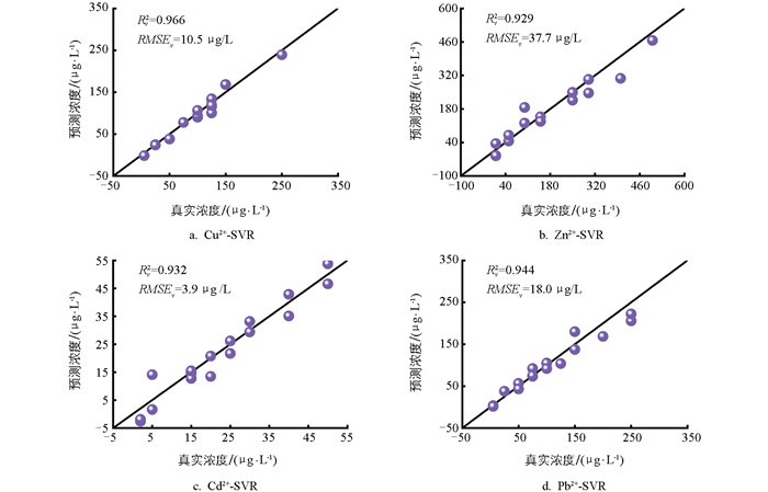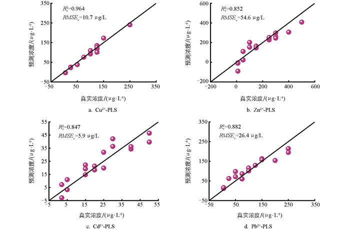 如图 10所示,ULR模型的检测精度整体较低,4种重金属的检测值与真实值偏差明显,尤其是Zn2+和Cd2+,其验证集决定系数Rv2出现负值,意味着模型无法有效检测这2种重金属离子的浓度。这一现象证明了在多种重金属共存的体系中,由于离子间存在严重交互干扰,溶出峰峰值电流与浓度之间不再遵循简单的线性关系,传统的ULR模型完全失效,无法满足准确检测的需求。引入了峰宽和峰面积特征后,建立的PLS模型检测精度相比于ULR有所提升,4种重金属的Rv2均达到0.8以上,如图 11所示,说明考虑溶出伏安信号的多维特征在一定程度上能够补偿多种重金属共存导致的信号干扰。但由于PLS本质上仍然属于线性回归模型,在处理严重的非线性干扰时,其校正能力仍然有限。从检测结果来看,除了Cu2+的rRMSEv为10.9%以外,Zn2+、Cd2+、Pb2+ 3种重金属离子的rRMSEv均大于25%,说明模型的检测精度仍有待提高。相比之下,SVR模型表现出最优的检测性能,其Rv2均达到0.9以上,rRMSEv降低至21%以下,4种金属离子的数据点均分布在1∶1线附近,如图 12所示,这一结果表明SVR模型能更好地拟合多维非线性关系,实现对重金属浓度的准确检测。