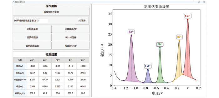 针对采集到的大量原始溶出伏安曲线,利用Python设计了一套重金属溶出伏安信号处理软件,旨在快速地实现数据处理和重金属浓度分析,软件界面如图 13所示。该软件集成了数据加载、S-G平滑滤波、自动寻峰以及特征提取等核心功能模块,能够快速提取溶出伏安信号的峰高、峰宽、峰面积等关键特征信号。软件内嵌了SVR模型,可同步检测Cu2+、Zn2+、Cd2+、Pb2+的浓度,并将结果导出到Excel表格中。该软件能够完成从原始信号到重金属浓度的全过程分析,为后续的土壤重金属检测提供了便捷的工具。