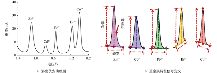 为了提高数据分析效率,利用Python编程语言编写数据处理程序。针对原始伏安信号中存在的噪声干扰,采用S-G(Savitzky-Golay)滤波算法对数据进行平滑处理。在此基础上,设计自动寻峰算法,通过溶出电流峰的电位、峰与峰之间的相对距离来识别重金属种类。在峰识别完成后,进一步获取峰电流、峰面积及峰宽等特征信号,用于后续建模分析。重金属溶出伏安曲线及其特征信号如图 2a所示,其中,各重金属峰高、峰宽和峰面积的定义如图 2b所示。