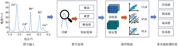 利用软件所提取的特征信号,采用3种算法,建立检测模型,试图校正重金属间的交互干扰,提高Cu2+、Zn2+、Cd2+、Pb2+ 4种重金属离子的检测精度。所建立的模型包括传统一元线性回归(Univariate Linear Regression,ULR)、偏最小二乘回归(Partial Least Squares Regression,PLS)、支持向量回归(Support Vector Regression,SVR)。模型为每种重金属独立训练,并分别评估性能以获得每种重金属的最优检测模型。整体模型构建框架如图 3所示。
