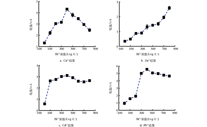 分析了Bi3+浓度、沉积电压和沉积时间3个关键参数对4种重金属溶出电流的影响,如图 4-图 6所示。