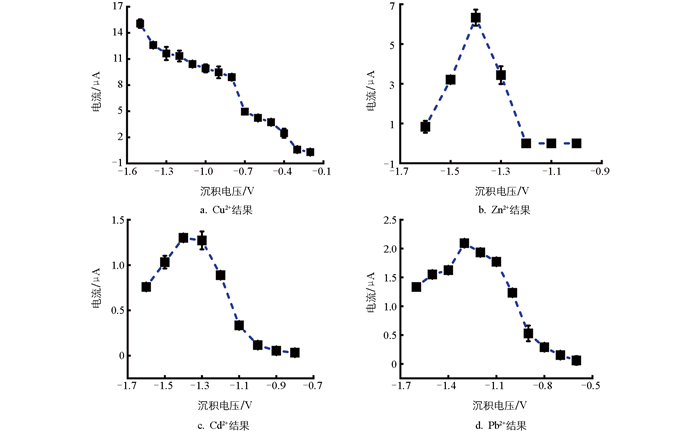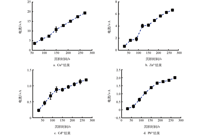 如图 5所示,沉积电压对重金属离子的溶出电流也存在一定的影响,这是因为沉积电压的降低有利于重金属离子的电还原富集,但沉积电压过负时,除Cu2+的信号持续增强外,Zn2+、Cd2+、Pb2+的溶出信号均呈现明显的下降趋势。由于在过负的电位下,H+会发生析氢反应,氢气泡附着在电极表面阻碍了重金属离子的沉积[36],还可能破坏Bi3+膜的稳定性,导致检测灵敏度降低[37]。具体而言,不同的重金属离子所需的最佳沉积电压不同,Pb2+和Cd2+均在-1.3 V处取得最大值,而Zn2+的最大值出现在-1.4 V处。为了综合考虑在多离子共存的情况下各金属离子的还原效率,同时避免析氢反应的发生,最终确定最佳的沉积电压为-1.4 V。