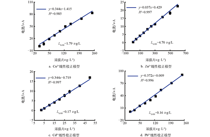 对4种重金属离子分别进行浓度梯度实验,得出其溶出电流峰值随浓度变化的曲线,由此计算出4种重金属的灵敏度、检测限。4种重金属均设置9个浓度梯度。其中,Cu2+浓度梯度为:5、25、50、75、100、125、150、200、250 μg/L;Zn2+浓度梯度为:10、50、100、150、200、250、300、400、500 μg/L;Cd2+浓度梯度为:2、5、10、15、20、25、30、40、50 μg/L;Pb2+浓度梯度为:5、25、50、75、100、125、150、200、250 μg/L。接着,分析峰电流y与浓度x的关系,并进行线性拟合。其中,斜率k即灵敏度,拟合公式为: