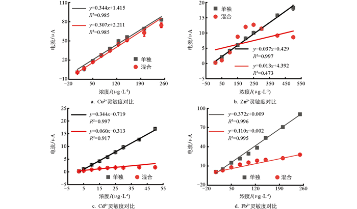 如图 9d所示,随着Pb2+浓度的升高,Cd2+电流信号强度呈缓慢增长趋势;当Pb2+浓度小于100 μg/L时,Zn2+电流信号有所升高;当Pb2+浓度大于100 μg/L后,Zn2+电流信号呈现缓慢下降趋势;Cu2+的电流信号强度基本保持稳定。