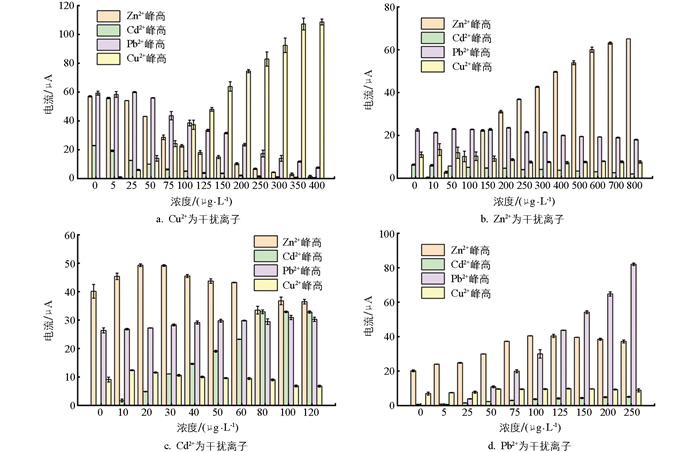 如图 9c所示,随着Cd2+浓度的升高,Pb2+电流信号强度呈缓慢增长趋势,Zn2+和Cu2+信号均先增强再缓慢降低。当Cd2+浓度大于10 μg/L后,Cu2+的电流信号开始下降,而Zn2+的电流信号在Cd2+浓度大于20 μg/L后开始下降。