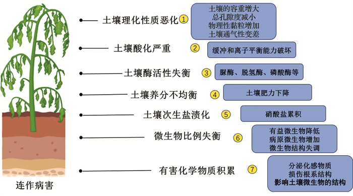 • 连作病害与作物根系分泌物在土壤中的分散和积累密切相关。植物根系主动利用ATP向根际分泌代谢物,并被动扩散这些分泌代谢物[54],包括氨基酸、糖、酚类、萜类、脂类等低分子化合物,以及多糖、核酸和蛋白质等高分子化合物。大多数代谢物被土壤微生物迅速降解和利用,但一些低分子化感物质,如苯甲酸、苯丙烯酸、对羟基甲酸、肉桂酸等,对作物有害[6, 55-56]。这些有害物质的影响主要体现在两方面:一是影响土壤微生物的结构和土壤的理化性质,使土壤微生态环境恶化,从而导致作物生长受阻;二是可以直接损伤作物根系的膜系统和抗氧化系统,不仅会降低作物的抗逆能力,还能抑制根系对常需物质和水分的吸收,降低光合效率,影响蛋白质等的合成。这种通过释放化学物质对同种作物产生生长抑制的现象称为自毒作用[57]。自毒作用主要发生在同种(或同科、属)的作物内,在连作情况下,有毒物质不断积累,作物的自毒作用愈加明显。因此,自毒作用引起的连作障碍是连作病害发生的重要因子之一。