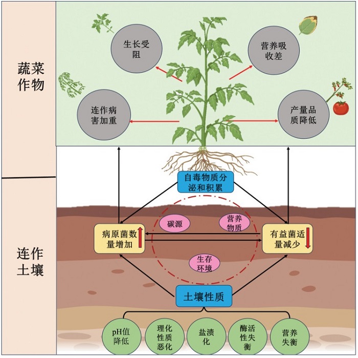 • 随着蔬菜产业的蓬勃发展,尤其是设施蔬菜种植以每年1.25%的速度持续增长的情况下,一些种植技术的弊端和瓶颈问题逐渐显现。其中,连作病害是制约蔬菜产业可持续发展的主要因素之一。因此,深入了解连作病害发生的根本原因,采取应对措施以最大程度地降低连作障碍产生的负面影响,实现蔬菜高质量发展,显得尤为重要。本研究分析了蔬菜连作病害发生的土壤因子,包括土壤理化性质恶化(土壤酸化、盐渍化、养分不均衡)、土壤酶活性失衡、土壤微生物群落结构失衡以及有害化学物质积累导致的自毒作用(图 2)。对土壤、环境、作物、微生物等多因素进行综合考量后,发现连作障碍可以通过科学管理加以延缓和克服。