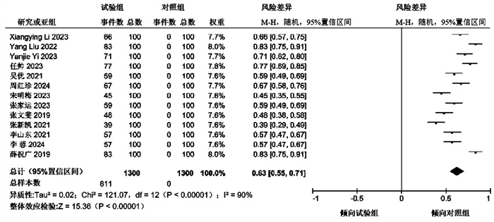 分析不同药剂对小麦纹枯病的防治效果,利用Review Manager 5.4软件对纳入的13篇文献中的811组数据进行Meta分析,森林图中显示了异质性检测结果:非均质性结果是Chi2 = 121.07,自由度(df)= 12(p < 0.00001);I2的异质性>50%,表明数据异质性大,符合采用随机效应模型。菱形小方块落在无效线右侧且未与无效线相交,表明与对照相比供试药剂对小麦纹枯病均具有显著防治效果(图 1)。同时对不同药剂防效的大小进行进一步分析。