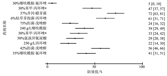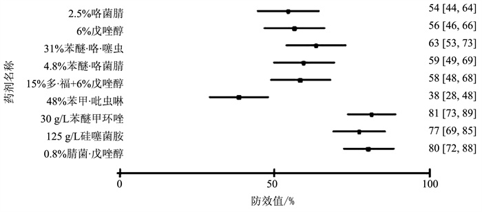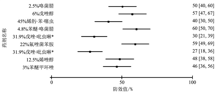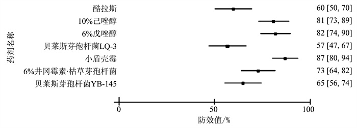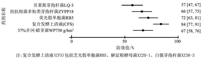 为评估不同生物药剂对小麦纹枯病的防治效果,本研究筛选了多种生物药剂,并对其防治效果进行了Meta分析(图 6)。