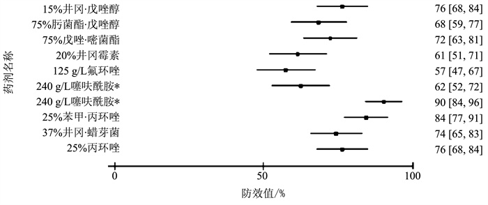 持效期长的药剂在施药90 d后仍然有效。例如,30%噻呋酰胺·氟环唑悬浮剂的防效为5%,防效最差;37%井冈·蜡芽菌可湿性粉剂的防效为72%,防效最好(图 5)。通过对比发现,37%井冈·蜡芽菌可湿性粉剂在药后15 d的防效为74%,而药后90 d防效为72%,随着时间的延长,防效下降缓慢。由于两组数据使用量以及试验地不同,不能明确此药剂持效期的实际天数,但为我们筛选药剂提供了方向。