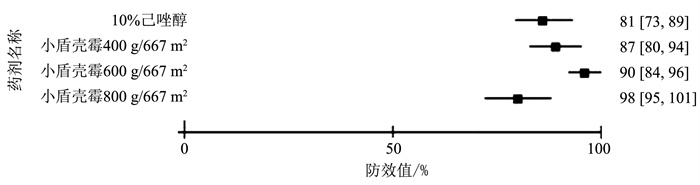 通过生物农药与化学农药的防效分析,发现小盾壳霉对小麦纹枯病的防效达到87%(图 8),高于化学农药6%戊唑醇防效的82%和10%己唑醇防效的81%(图 7)。对小盾壳霉不同用量的防效进一步经过Meta分析发现:小盾壳霉每667 m2用量为400 g时防效达87%,每667 m2用量为600 g时防效达90%,每667 m2用量为800 g时防效可达98%,均远高于10%己唑醇的防效(图 8),这为小麦纹枯病的安全用药提供了更多选择。