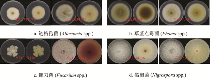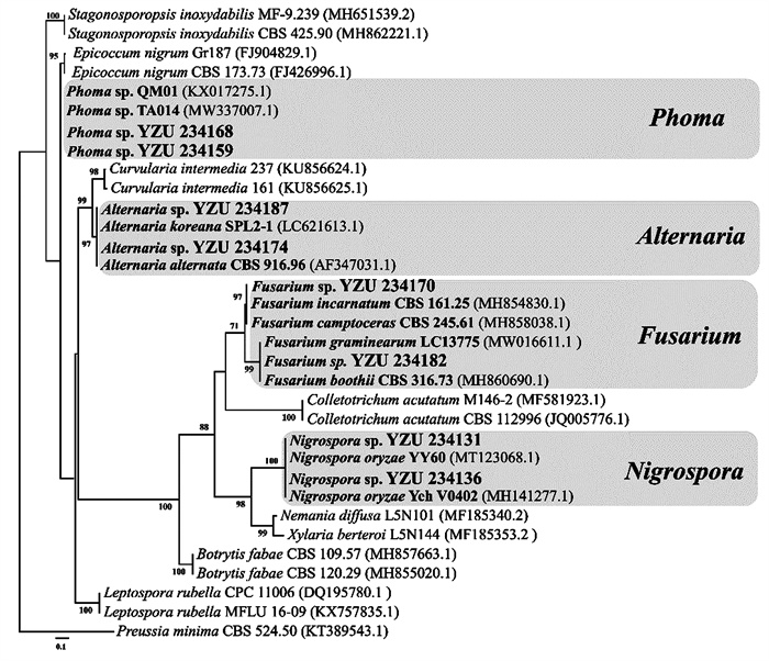 通过对供试的8株菌株的ITS基因进行PCR扩增和测序,获得目标DNA序列后,利用BLASTn进行比对,并构建NJ系统发育树。结果显示,这8个菌株分别隶属于4个属,分别为链格孢属(YZU234174与YZU234187)、草茎点霉属(YZU234168与YZU234159)、镰刀菌属(YZU234170与YZU234182)和黑孢属(YZU234136与YZU234131)(图 2)。