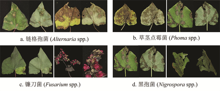 叶片主要病害类型包括叶斑病、轮纹病、斑枯病及枯萎病(图 3)。病原学分析表明,链格孢菌(Alternaria spp.)与草茎点霉菌(Phoma spp.)所致病害发生频率及严重度显著高于镰刀菌(Fusarium spp.)与黑孢菌(Nigrospora spp.)(表 1)。典型症状表现为:链格孢菌侵染时,叶片上形成不规则或椭圆形的病斑,具深浅交替的同心轮纹,病斑边缘呈黄褐色晕圈,病健交界清晰;随着病程发展,病斑中央组织坏死并穿孔,多个病斑融合后导致叶片大面积枯死(图 3a);草茎点霉菌侵染时,病斑沿叶脉定向扩展,叶正面出现区域性褪绿斑,主要出现在植株基部的衰老叶片(图 3b);镰刀菌侵染则引发叶片与花序的系统性枯萎,初期叶缘出现浅褐色不规则斑块,在干旱条件下,病部迅速失水并形成脆性坏死区(图 3c);黑孢菌侵染时,除了引起普通叶斑症状外,叶正面还散布不规则的黑色斑块,斑缘伴随黄化现象,但叶背面组织结构保持完整,呈现典型的“单面显症”特征(图 3d)。