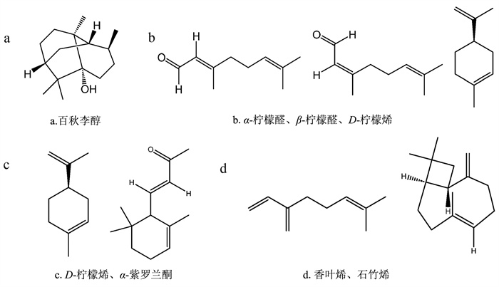 对4种中药挥发油活性成分进行测定,采用高效液相色谱分析[9]。广藿香挥发油主要成分确定为百秋李醇(图 1a),其中百秋李醇的含量为26%。山苍子主要成分为α-柠檬醛、β-柠檬醛和D-柠檬烯(图 1b),3种成分占比达68%。苍耳子挥发油主要成分为D-柠檬烯、α-紫罗兰酮等物质(图 1c),其中萜类成分占比达67%。黄连挥发油主要成分为香叶烯、石竹烯(图 1d),其含量占挥发油比例分别为19%和18%。二氢卟吩铁分子式为C34H31ClFeN4O6·3H,相对分子质量为685.9[14]。