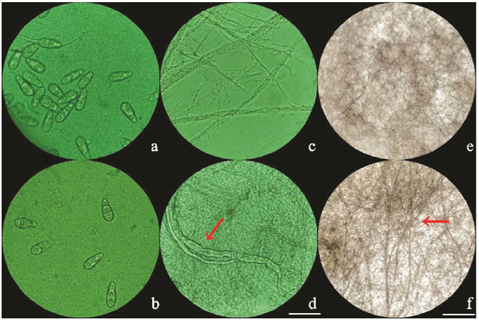 实验对各处理组进行了显微观察。在高倍镜下观察阴性组和复合药剂处理组的孢子悬浮液,在相同视野范围内,阴性组(图 2a)孢子悬浮液密度较大,孢子数量较多;复合药剂处理组(图 2b)孢子悬浮液密度明显降低,数量较少。高倍镜下观察菌丝形态,发现阴性组(图 2c)菌丝分明、形态纤细光滑,复合药剂处理组(图 2d)菌丝发生曲折,褶皱明显(箭头标识)。在低倍镜下观察,发现阴性组(图 2e)菌丝纤细、分明、轮廓清晰,复合药剂处理组(图 2f)菌丝肿胀较为明显(箭头标识)。由此可见,复合药剂处理会破坏菌丝的正常形态,影响病菌正常生长。
