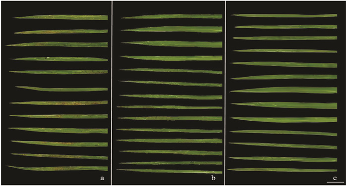 田间观察发现,对比阴性对照组,处理组常见水稻害虫数量明显减少,水稻叶片残存水分减少,表明挥发油起到了良好的气味驱虫、燥湿化湿效果。其中,山苍子挥发油病斑抑制效果最佳,最高达72.94%;其次是广藿香挥发油,最高防效达71.82%。在配伍二氢卟吩铁后,两者产生明显的协同增效效应(图 3),阴性组稻叶枯黄、病斑密集(图 3a),0.15%山苍子挥发油单药防治效果为72.94%(图 3b),配伍二氢卟吩铁后组成的复合药剂,防治效果达到95.43%(图 3c)。通过单因素方差分析(ANOVA)得出,中药挥发油防治效果的F值为1.583,p值为0.269,表明在统计学意义上,不同中药挥发油处理组与稻瘟灵处理组之间的防治效果没有显著差异;复合药剂防治效果的F值为1.303,p值为0.346,表明在统计学意义上,不同复合药剂处理组与稻瘟灵处理组之间的防治效果也没有显著差异。