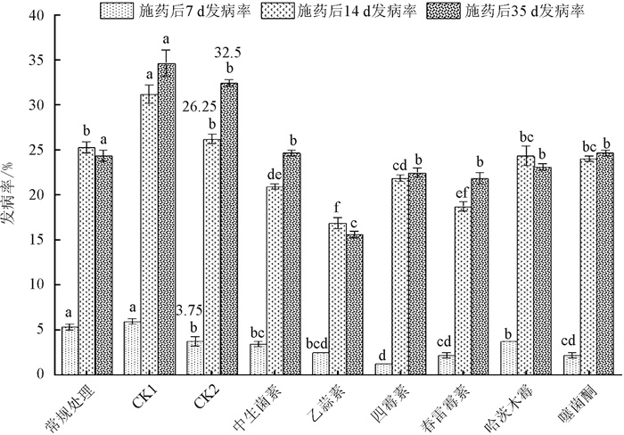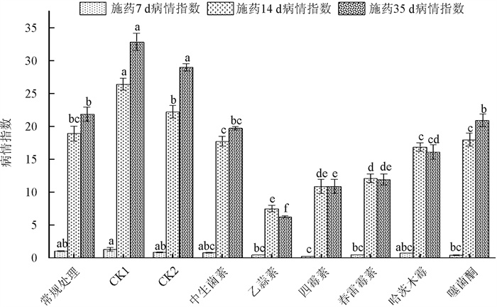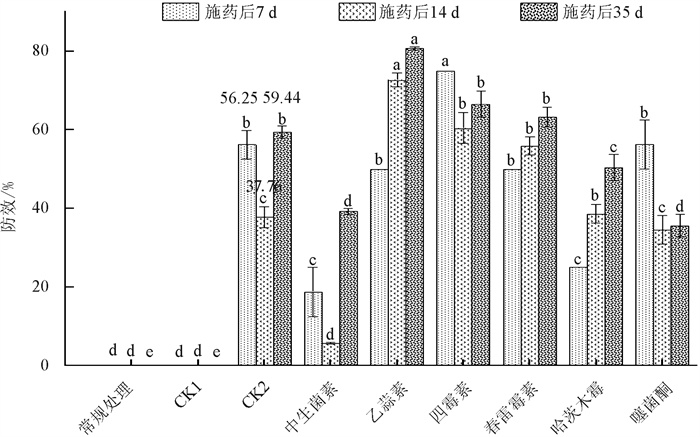 通过生姜套袋栽培中药剂田间防治效果(图 3)可知,乙蒜素、四霉素和春雷霉素对姜瘟病的防治效果相对较好,施药后35 d,对姜瘟病防治效果分别可达80.77%、65.38%和63.27%;而哈茨木霉、中生菌素和噻菌酮对姜瘟病的田间防治效果相对较差,施药后35 d防治效果分别为50.38%、39.23%和35.58%。