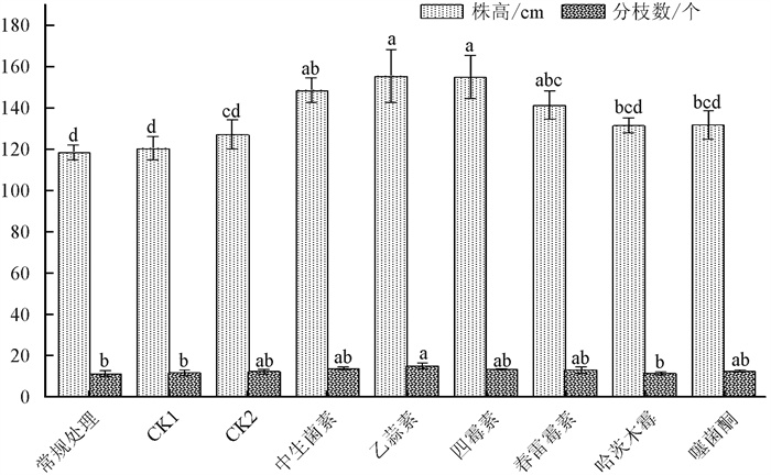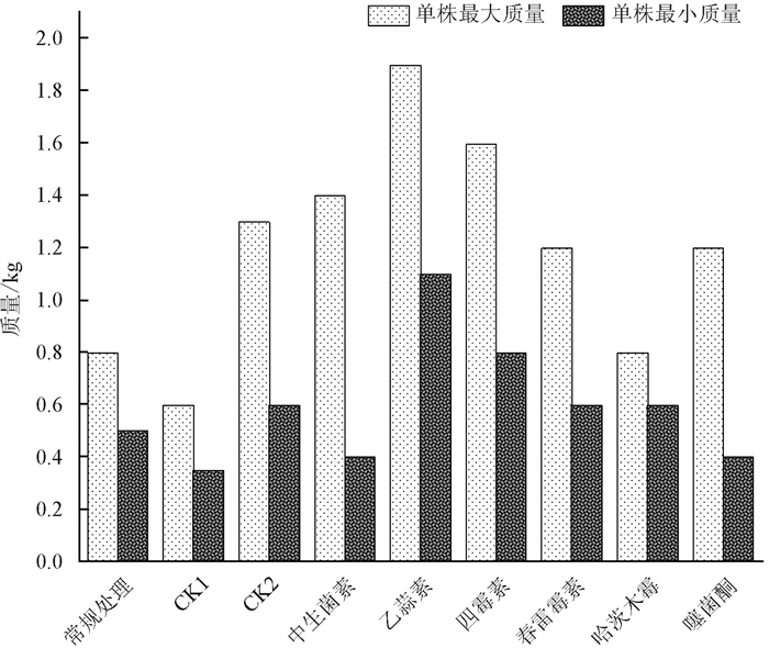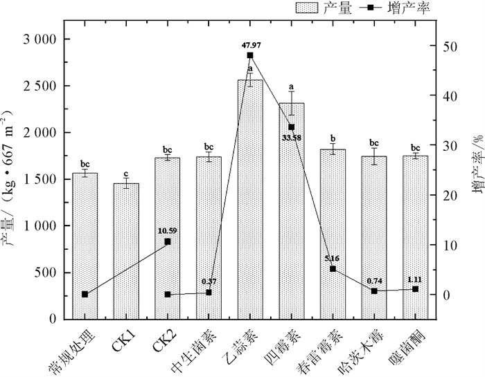 由图 4、图 5和图 6可知,套袋栽培法与常规栽培法相比,田间生姜植株株高和分枝数无明显差异,而单株重量和产量存在显著性差异。套袋栽培法生姜单株最大重量为1.30 kg,每667 m2产量为1 734 kg;常规栽培法生姜单株最大重量为0.80 kg,每667 m2产量为1 568.00 kg,套袋栽培法的产量比常规栽培法提高了10.59%,这可能是因为套袋栽培中土壤透气性和导水性相对常规栽培中较好,可提高生姜植株的抗病性,且有利于生姜植株生长。套袋栽培中,四霉素和乙蒜素处理后田间生姜植株株高和分枝数无明显差异,但可显著提高生姜产量,每667 m2产量分别为2 316.80 kg和2 566.40 kg,分别比套袋栽培法提高了33.58%和47.97%;而中生菌素、哈茨木霉和噻菌酮处理后生姜产量提高相对较低,每667 m2生姜产量分别为1 740.80 kg、1 747.20 kg和1 753.60 kg,分别仅比套袋栽培法提高了0.37%、0.74%和1.11%。