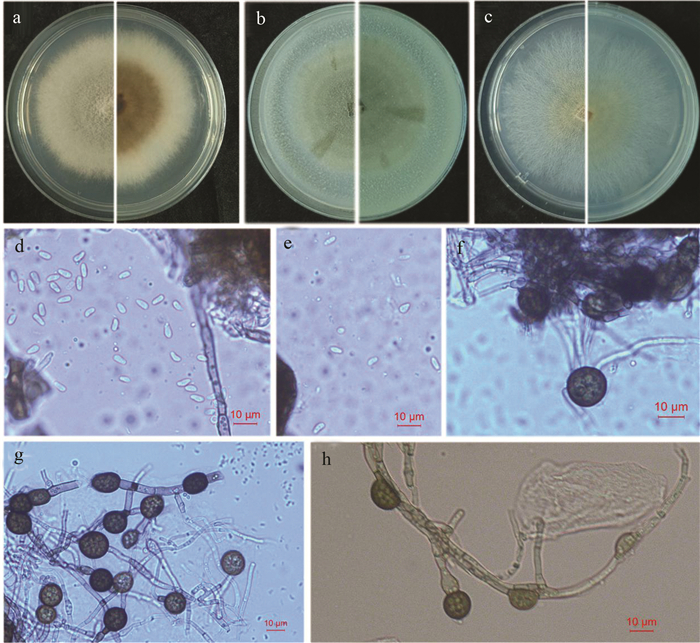 • 在PDA培养基上NM005菌株,菌落呈圆形(图 2a),正面最初为白色,而后菌落逐渐变成灰白色,且菌丝浓密。背面形似两个同心圆,边缘规则,呈灰白色,中间呈棕褐色;在OA培养基上菌落呈轮纹状(图 2b),由外向内颜色由灰白色逐渐变成褐色,部分位置后期变成黑色;在MEA培养基上,菌落呈轮纹状(图 2c),菌丝稀疏,菌落颜色由外向内由白色变成淡黄色。在OA培养基上培养7 d,菌落长出黑色硬质点状物质和黑色菌丝。挑取黑色硬质点状物质至显微镜下观察,可看到分生孢子,分生孢子呈椭圆形或橄榄球形,无色,大小为1.79 μm×4.37 μm至3.55 μm×6.72 μm(n=35)(图 2d~2e);挑取黑色菌丝至显微镜下观察,可看到厚垣孢子,厚垣孢子散生、间生或顶生,多为单个圆形,黑色或褐色,直径为10.60~16.35 μm(n=35),少量椭圆形或梨形,偶有两个或两个以上粘连的情况(图 2f~2h)。