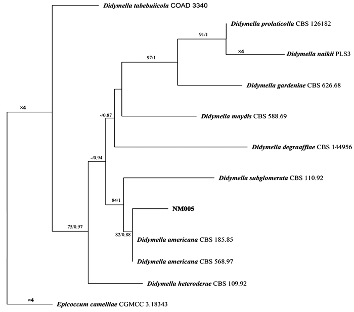 • 使用ITS(引物ITS1/ITS4)、LSU(引物LSU-LR0R/LSU-LR7)、TUB2(引物Bt2a/Bt2b) 3对引物对NM005菌株的DNA进行PCR扩增,利用NCBI上下载的菌株序列(表 1)与NM005菌株序列,基于ITSLSUTUB2基因序列以最大似然法构建系统发育树,结果显示,NM005菌株与Didymella americana聚在一支,其亲缘关系最近,支持率为82%。基于贝叶斯法构建的系统发育树同样表明,NM005菌株与D. americana聚在同一分支,支持率为88%,因此,将NM005鉴定为D. americana(图 3)。