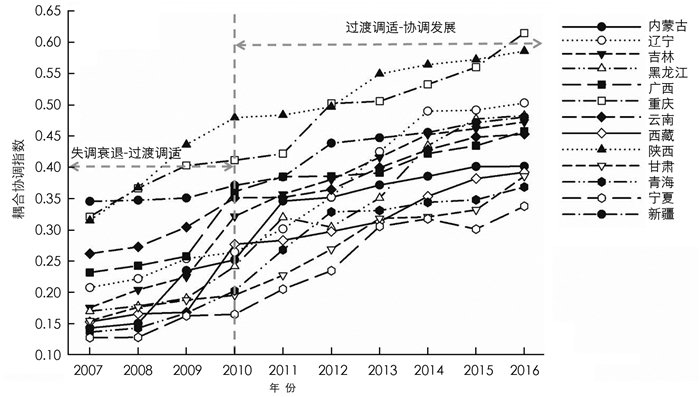 如图 1所示,整体上“一带”各省(直辖市、自治区)前一年的耦合协调指数上升轨迹会延续到后续的年份,由此可以判断,这些省(直辖市、自治区)的人口、经济与环境的耦合协调水平在今后较长时期内仍能保持上升的趋势,在没有较大干扰的情况下,将会进入“协调发展”阶段的较高水平,但此过程存在明显的区域差异.如:辽宁在2010年的耦合协调指数(0.254)处于“中度失调衰退”水平,但到2016年则到达“勉强耦合协调”(0.503)水平,同属东北地区的吉林和黑龙江也存在类似轨迹;青海虽然耦合协调处于较低水平,但在2012年之前一直平稳上升,之后升幅收窄.