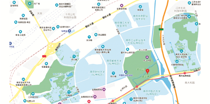 随机区域的植被研究对分析城市化进程与已有植被的作用极为重要,存在较大科研价值[5]. 研究区域位于南京主城的东部,经纬度的坐标为:东经118°46′,北纬32°03′,平均海拔高度为20~30 m,多为丘陵地貌,是典型的亚热带季风气候,四季较为显著,研究区域示意图如图 1所示. 年平均降水量为1 101 mm、平均气温是15.5 ℃,土壤以红壤土为主[5]. 此区域是我国早期形成的自然景观. 在构建开始时,附近的高校、住宅区、公园等应运而生,以至于此区域的天然次生林遭到大范围破坏,尽管位于新疆阿勒泰地区的喀纳斯景区成立时间也较早,但由于人烟稀少,因此树木保存较好,可见人流对景观区树木的影响很大[6]. 通过调查可知,仙林区域的树木以构树为主,因此,本研究以南京仙林地区的构树种群为对象,对仙林入口、南京师范大学、南京邮电大学、南京大学和羊山湖等20个地段进行种群间联结关系研究,这些地段占据了仙林区域的较大范围,覆盖度较好,希望通过对这些地方构树种群的分析为构树种群的均衡发展提供一定参考.