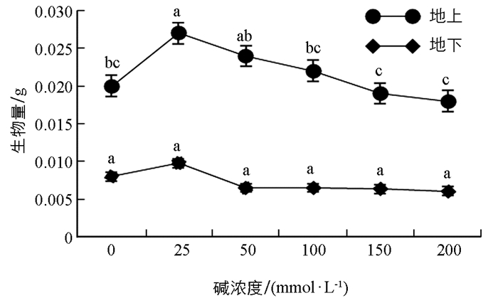 从图 6和图 7中可以看出,随着碱浓度的升高,青燕一号地上部分和加燕一号地上部分与地下部分的生物量均呈先升高后逐步降低的趋势,即低浓度(25 mmol/L)促进高浓度(≥50 mmol/L)抑制. 加燕一号碱胁迫对地上部分生物量的影响较明显,而两种燕麦地下部分的生物量在碱胁迫下差异无统计学意义.