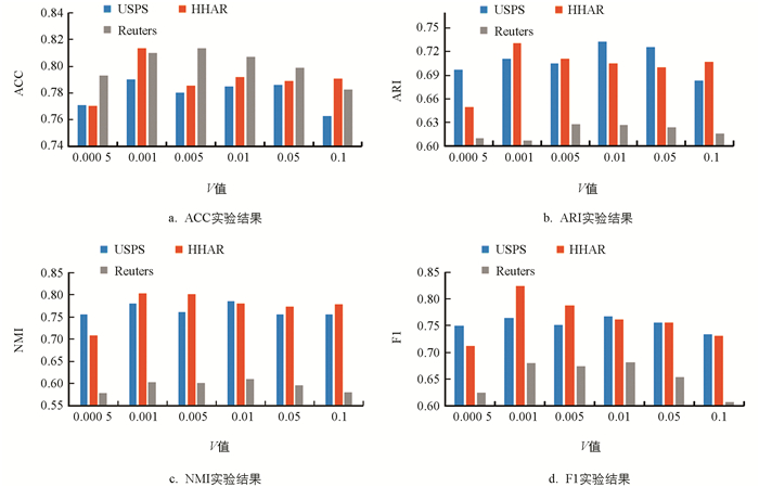 虽然簇中心样本和边缘样本之间建立了关联关系,但并不是所有的边缘样本都和该类簇的簇中心样本建立直接关系. 仍然存在部分边缘样本处于类簇交叉区域,当v取值不同时边缘样本所在类簇的隶属程度可能较大,因此本研究使用多数投票机制判断边缘样本的类别. 图 3展示了部分数据集在不同v值的4个聚类指标结果,通过图 3可以看出每个边缘样本和核心样本的联系比例v的大小不同,最终的聚类效果会有所差别. 在v=0.001或者0.005时性能最好,但在v=0.000 5或者v=0.1时聚类效果会下降,这是因为v偏小时,会出现一个孤立的边缘样本与小部分的簇中心样本建立联系,容易出现误差. v偏大容易出现一个边缘样本与多个其他类簇偏远的样本建立联系,最终由多个决定,簇种类越多,距离越远,边缘样本的学习效果越差.