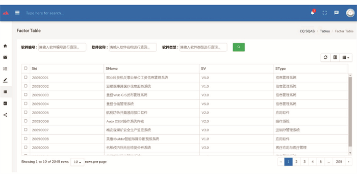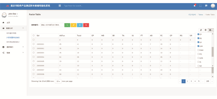 依据不同的展示对象对测试样本数据进行分类后搭建数据分析模块. 该模块主要实现了对数据库中基本信息的查看以及多条件查询功能,用来辅助研究人员进行数据分析工作. 图 7和图 8分别展示了对软件产品基本信息数据的多重条件查询功能以及对软件产品外部质量特性指标数据的管理功能,便于研究人员在庞大的测试样本数据中筛选出需要的数据并进行管理. 同时,为满足交互需求,该模块还增添鼠标悬停、分页展示等操作.