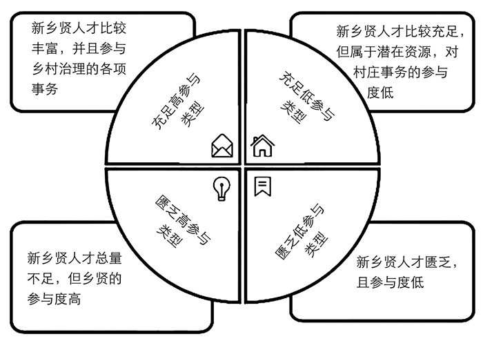 村庄调研的目的,在于深刻认识村庄差异性以及所孕育的新乡贤人才资源状况,从而因地制宜,分类施策。因此,对于村庄样本的选择,尤为重要。村庄差异性如村庄的社会结构特征、村庄的发展状况等会影响新乡贤的构成和分布,而新乡贤的类别则直接影响其治理模式的选择。立足微观视角,由于村庄差异性影响因素多元而复杂,我们很难把握其分类,但是从结果维度即新乡贤类别来看,不论村庄差异性如何,都可以从新乡贤人才状况与新乡贤参与情况这两个方面来组合划分类型。假设将新乡贤人才状况用充足与匮乏来衡量,新乡贤参与度用高和低来衡量,两两组合就可以得到四种新乡贤类型(见图 1):