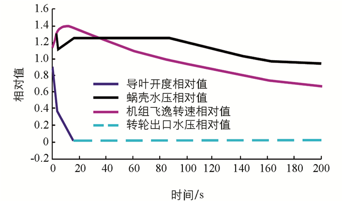 由图 6可知,在工况3下,导叶开度相对值从全开y=1.0线性关闭到y=0时,机组飞逸转速相对值迅速增大至1.35 Nr,随后机组飞逸转速相对值由1.35 Nr缓慢减小至0.64 Nr;蜗壳水压相对值迅速增大至1.22 H0,随后蜗壳水压相对值由1.22 H0缓慢减小至0.98 H0;转轮出口水压相对值变化不大.