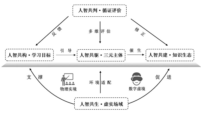 在此过程中,虚实场域为其他要素提供适配载体,学习目标引导三元主体协同方向,三元主体的认知互动推动知识生态的持续创生,循证评价则反哺整个体系的迭代升级。各要素既各自承载特定功能,又在结构上相互支撑、运行中循环赋能,形成动态平衡的协同体系。