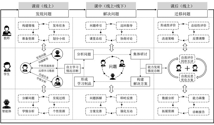 课前发现问题阶段,教师与智能体基于虚实融合的“意义场域”协同构建问题情境。智能体通过思维链技术分解问题,以渐进式步骤使问题求解过程显性化,从而降低学生的认知负荷。由此,学生能够在问题情境中自主探索问题,深化个体认知建构与社会性学习体验。例如,在《有氧呼吸的过程》知识学习中,智能体的问题化提示能够有效激发学习者的积极情绪[40]。课中解决问题阶段,以“生师—生智—生生”多维协作互动为核心,旨在培养学生的批判性思维和创新能力。作为问题解决的主体,学生在教师引导下,通过小组研讨活动深度剖析问题,并经由知识整合与协商、问题求解策略实施及成果展示与交流等环节,共同生成问题解决方案与学习制品。智能体通过多轮对话促进学生深度思考,并以可视化方式辅助问题解决。它将真实问题拆解为可被计算的问题链,从问题抽象到方案落地,转化为具体可操作的问题解决方案[41],帮助学生构建系统化的知识体系和框架。课后迁移问题阶段,智能体基于对学生学习行为数据的挖掘与分析,构建其问题解决能力画像,包含认知策略、协作效能、创新思维等维度,据此生成诊断报告,进而智能推荐进阶式探索问题与个性化学习资源,以有效支持学生的自我导向学习。教师依据智能分析结果,融合形成性评价与总结性评价方法,重点评估学生的问题解决能力与知识迁移能力,为后续教学决策的精准优化提供依据。学生则基于多主体的评价反馈,开展元认知层面的深度反思,并通过持续迭代的改进过程深化对问题的理解,优化问题解决方案,从而实现元认知能力的提升。