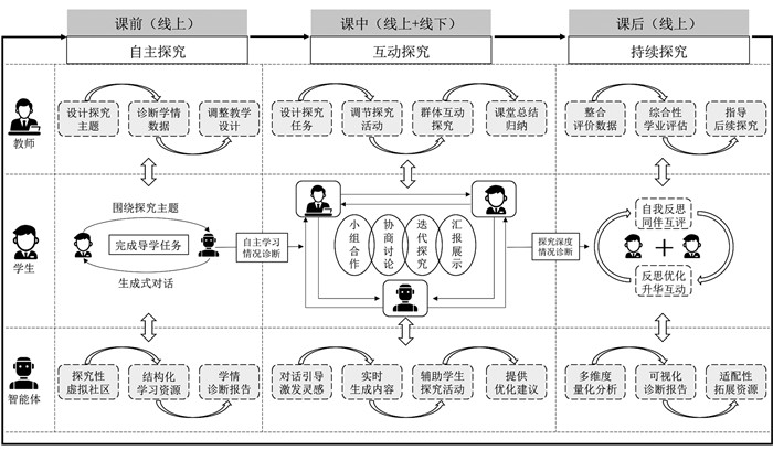 课前自主探究阶段,教师与智能体基于学习目标协同设计探究主题与任务框架。教师可通过学习行为数据与反馈报告,识别学生在自主探究过程中遭遇的学习困难,进而动态调整教学设计与干预策略。学生则利用智能体和虚拟仿真资源,以小组为单位完成导学任务,开展自主探究学习。在此阶段,智能体既可以构建指向探究性学习的虚拟社区,辅助学习者聚焦探究主题和开展高效学习,也能够设计指向新知建构的学习任务,提供结构化学习资源与启发式问题支架,驱动学生认知发展与思维进阶。课中互动探究阶段,教师负责设计“小组合作—协商讨论—迭代探究—汇报展示”多重探究任务,通过提供认知支架,引导和调节学习者的探究活动,从而促进学生的知识建构从个体建构向社会化协商转变。如教师可将GAI引入课堂,通过多屏协同系统开展多层次互动,促进深度知识的输出[32],启发学生对于概念性知识的深度建构与意义协商。其中,智能体作为认知中介,通过实时生成内容与引导对话,促进学生之间的观点碰撞与多元视角整合,为学生的探究学习提供认知支持。课后持续探究阶段,聚焦师生及同伴间的深度交流,旨在进一步探究前序环节中的遗留问题。智能体依托学习分析技术,对学生的探究过程数据及成果产出进行多维度量化分析,生成可视化学习诊断报告,并基于分析结果智能推送适配性拓展资源与改进建议。教师可整合智能体生成的过程性评价数据与课堂表现记录,从知识建构深度、批判性思维水平、协作效能等维度进行综合性学业评估,并基于诊断性反馈报告指导学生的后续探究学习。学生则通过合作梳理、加工与提炼探究成果,开展基于量规的自我反思与同伴互评,以促进知识的协同建构。