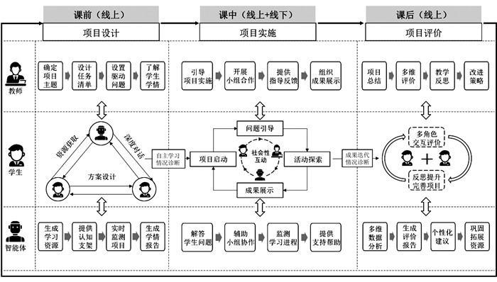 课前项目设计阶段,教师基于学习目标,与智能体协同设计项目的整体框架和任务清单,并在此基础上设置驱动性问题,引导学生在真实情境中启动项目。智能体通过知识图谱技术生成结构化学习资源,为学习者提供个性化认知支架;同时,基于学习分析技术实时监测学生的项目准备情况,为教师提供学情诊断报告,以支持其优化教学设计。学生可以通过数字化学习平台获取项目资源,与智能体进行深度对话以掌握相关知识,并在小组协作中形成初步的项目设计方案。如在《产品设计》项目课程中,智能体能显著提升从概念、构思到可视化的作品设计效率,增强学生的自我效能感[43]。课中项目实施阶段,教师根据项目任务结构,按照项目启动、问题引导、活动探索、成果展示四个阶段,引导学生开展小组合作学习。学生通过社会性互动实现知识的深度内化,其认知发展体现在项目成果的迭代完善过程中。智能体作为认知工具,实时监测学习进程,提供即时反馈与资源推荐,为学生提供认知工具与资源支持,协助其高效完成项目任务。例如,在《垃圾分类》跨学科课程中,教学智能体可以实现任务设定、任务规划、资源生成、学习支架、代码生成与反馈等多种功能[21]。课后项目评价阶段,智能体可整合学生自评、小组互评、教师评价等多维度数据,自动生成项目评价报告,并提供个性化学习建议和巩固拓展资源,以帮助教师和学生更全面地了解项目实施情况,助力学生课后深化学习。教师可对学生在项目学习中的综合表现进行多维度的评估,反思项目设计与组织过程,制订改进策略。学生则通过多角色的交互评价,从项目参与度、知识与技能的掌握程度、作品完成质量以及团队协作效能等维度进行深度反思与交流,进一步完善自身的知识体系和能力结构。